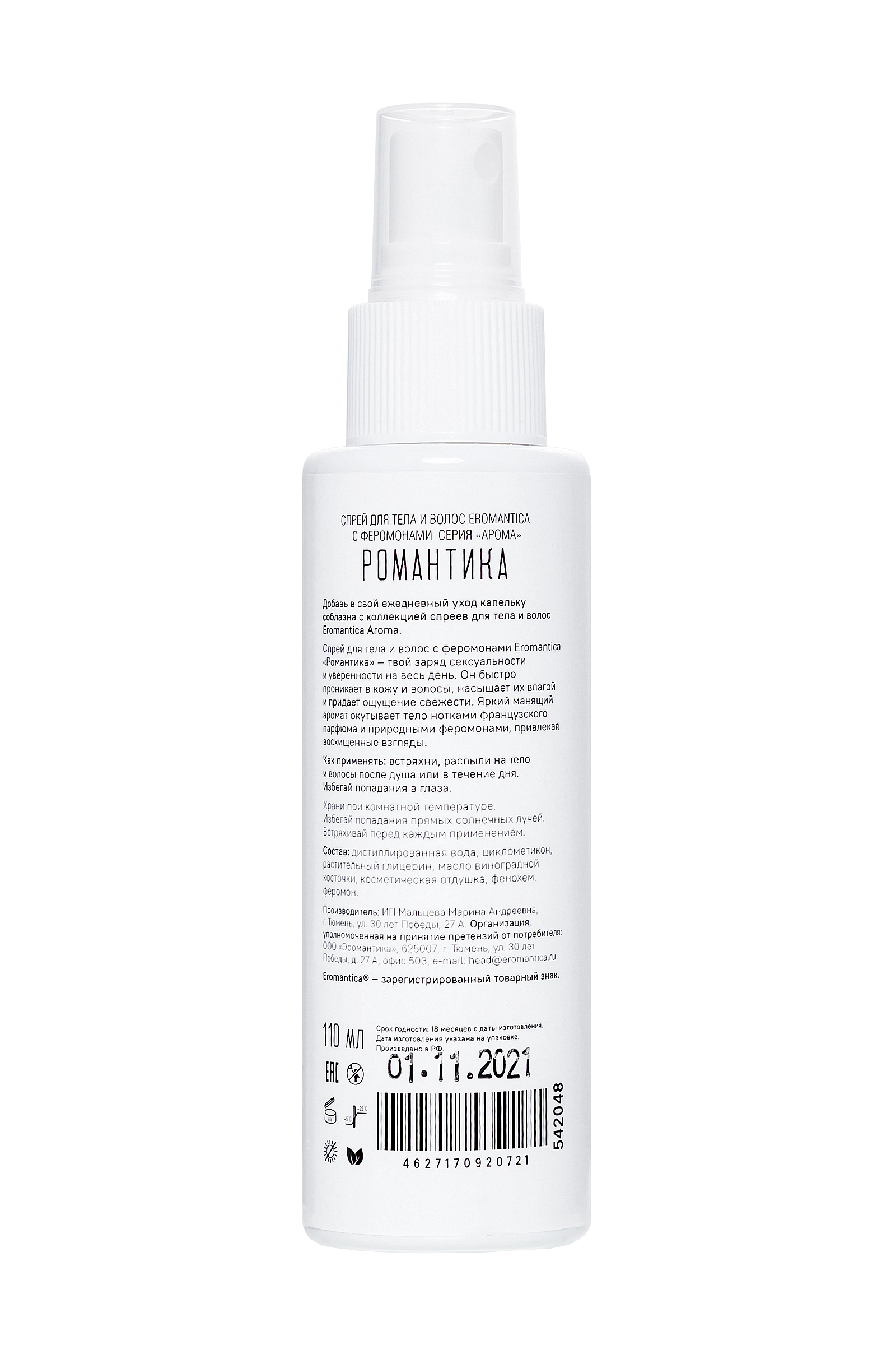 Поднимает настроение до небес, дарит ощущение легкости и очарования. Благодаря природным феромонам и легкому аромату летнего свидания ты становишься особенно привлекательной в глазах противоположного пола и чувствуешь уверенность в любой компании с новым спреем из коллекции Эромантика Aroma «Романтика». Освежает, увлажняет, тонизирует лицо, тело и волосы.